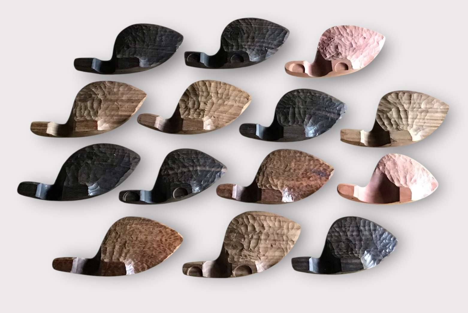 新たに2種類の 顎当てを制作しました フレッシュ型とバーバー型 です 材はローズ紫檀です 左の方が バーバー型 右の方が フレッシュ型です